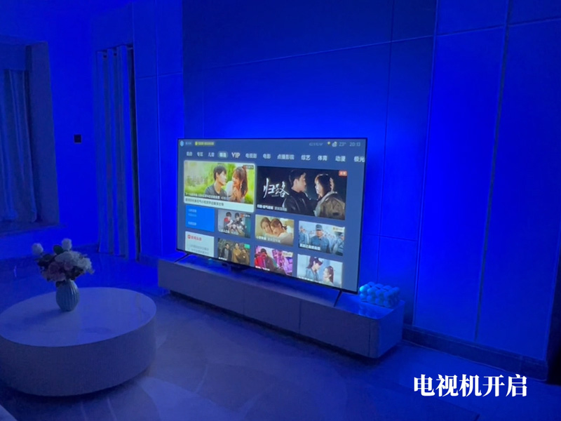 当我们说出“观看电影”的时候,窗帘自动闭合,遮光帘落下;主灯缓缓熄灭,背景氛围灯亮起柔和的暖光,投影仪自动开机,幕布徐徐降下…